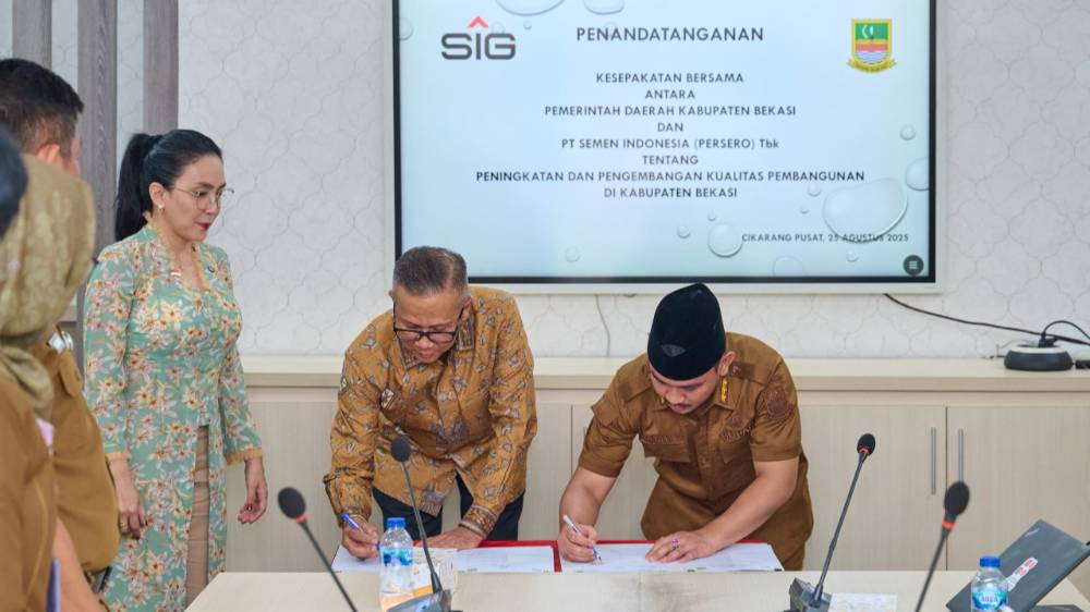 Penandatanganan Kesepakatan Bersama dilakukan oleh Bupati Bekasi, Ade Kuswara Kunang dan Direktur Utama SIG, Indrieffouny Indra, serta disaksikan oleh Ketua Dewan Penasihat Bupati Bekasi sekaligus Anggota Komisi VI DPR RI, Rieke Diah Pitaloka di Kantor Bupati Bekasi pada Senin (25/8/2025).