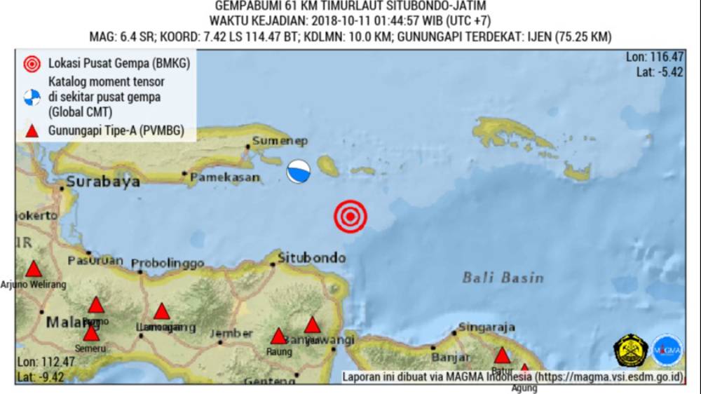 Menurut informasi dari Badan Meteorologi Klimatologi Geofisika (BMKG), pusat gempa berada di laut, 56 kilometer Timur Laut Situbondo, dengan kedalaman dangkal hanya 10 kilometer.