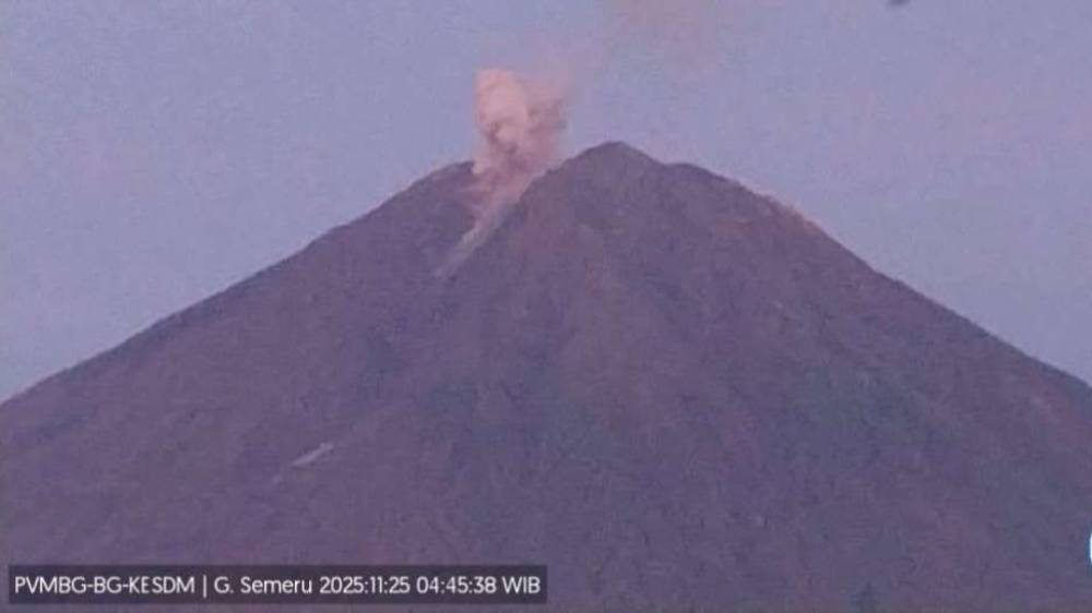 JATIMPLUS.COM – Gunung Semeru kembali menunjukkan aktivitas vulkanik signifikan pada Selasa (25/11/2025) pukul 04.45 WIB. Laporan resmi PVMBG yang disampaikan Petugas Pos Pengamatan Gunungapi Semeru di Gunung Sawur, Mudkas Sofian, mencatat erupsi disertai kolom abu setinggi sekitar 800 meter di atas puncak, atau kurang lebih 4.476 meter di atas permukaan laut. Kolom abu tampak berwarna putih hingga kelabu dengan intensitas sedang dan bergerak ke arah utara.